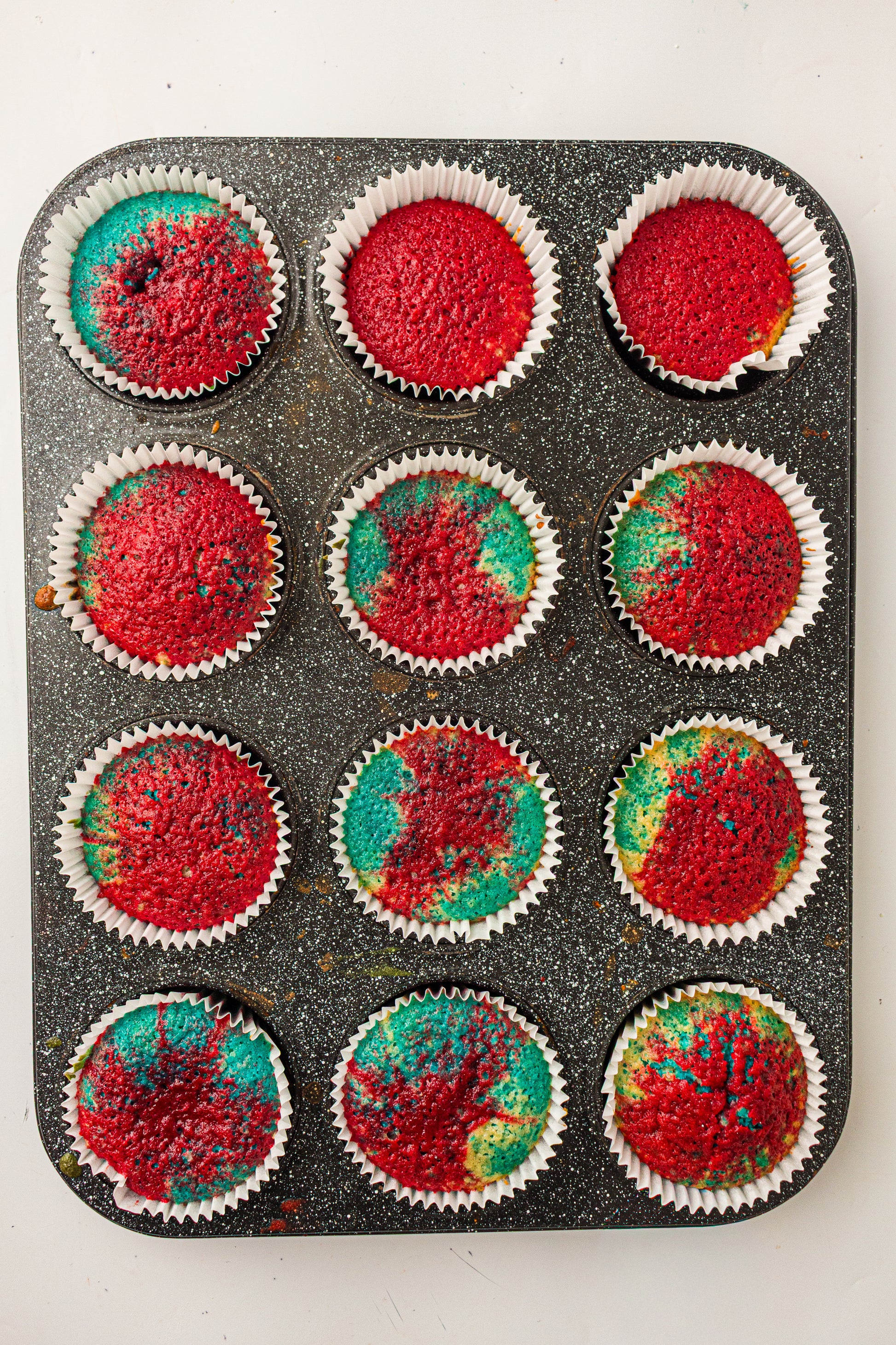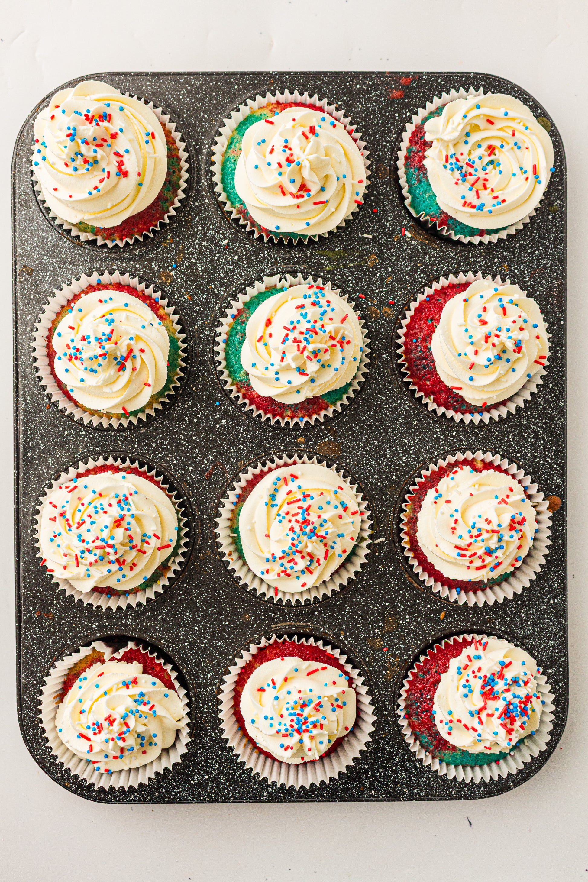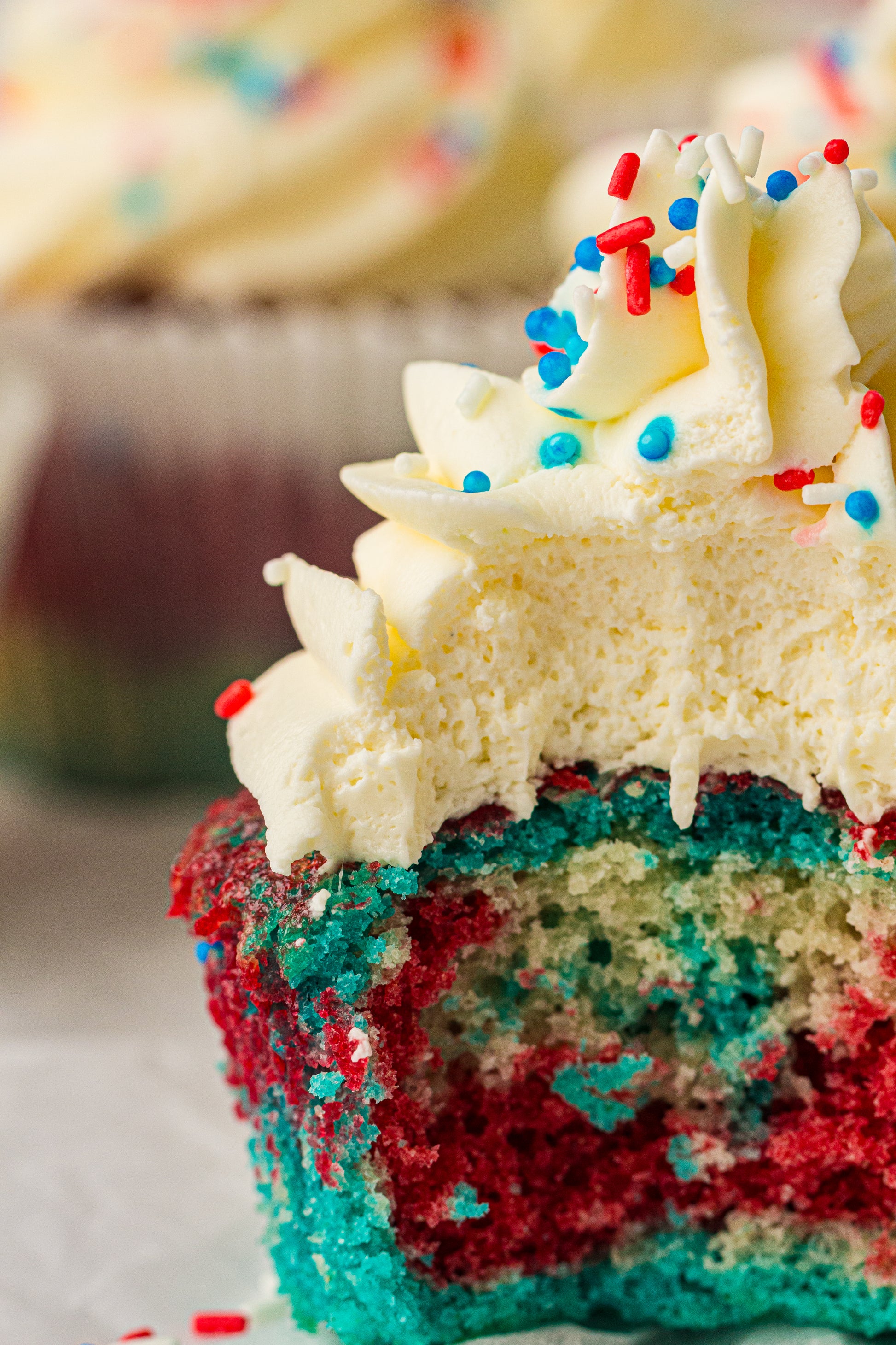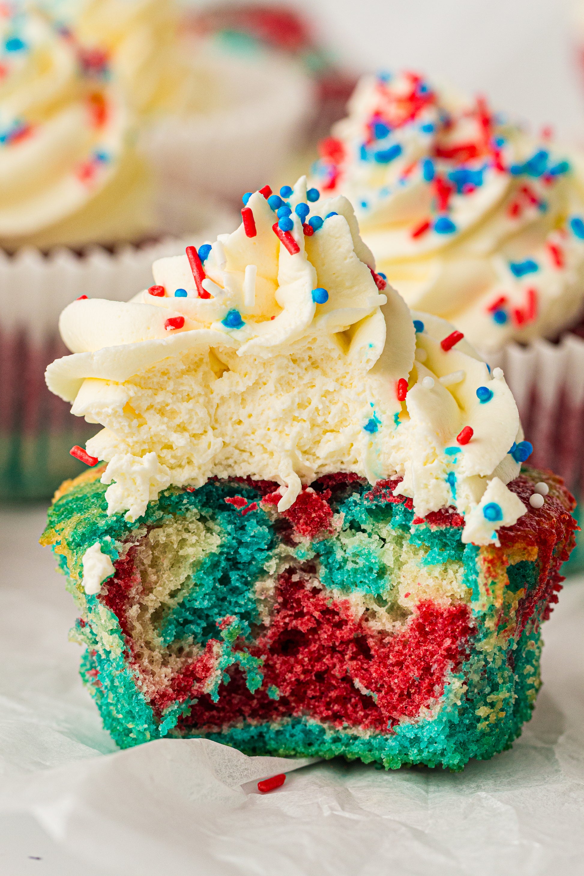 Bright red, white, and blue cupcakes made using a layered method that keeps the colors clean and separate — not muddy. Perfect for patriotic parties and 4th of July dessert tables.