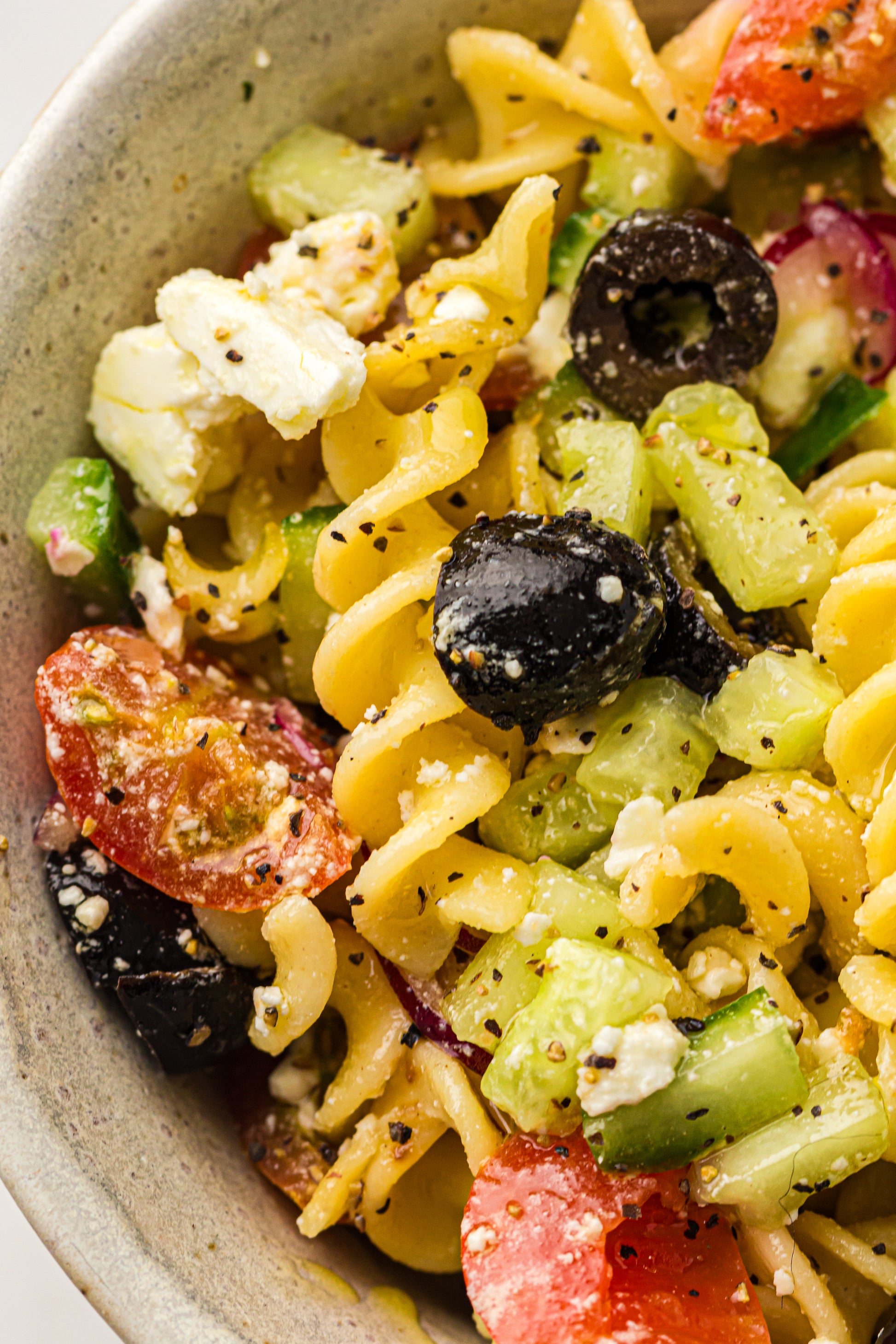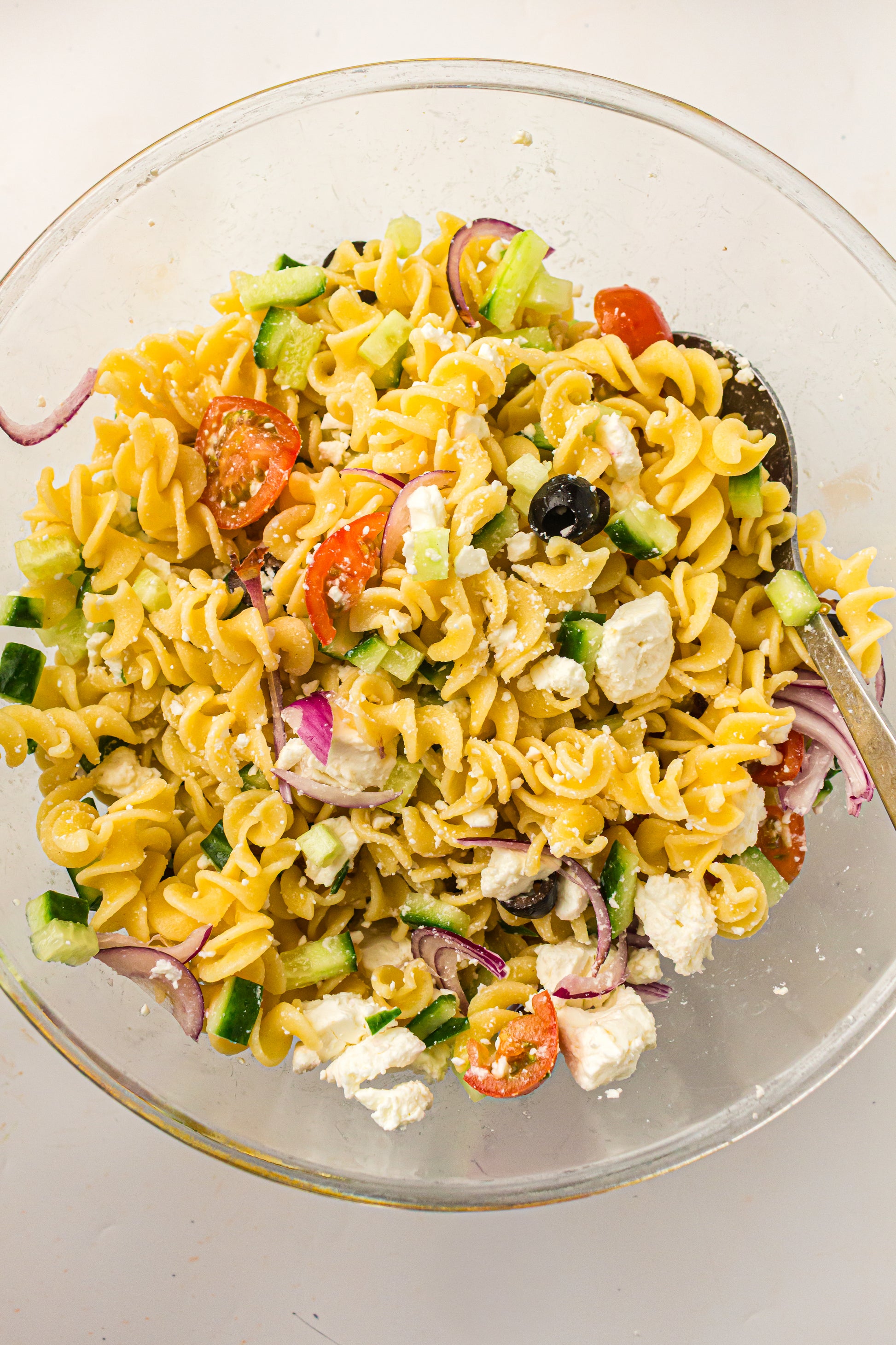 A vibrant, fresh pasta salad loaded with cherry tomatoes, cucumber, red onion, olives, feta, and a simple olive oil dressing. Light, colorful, and perfect for summer traffic.